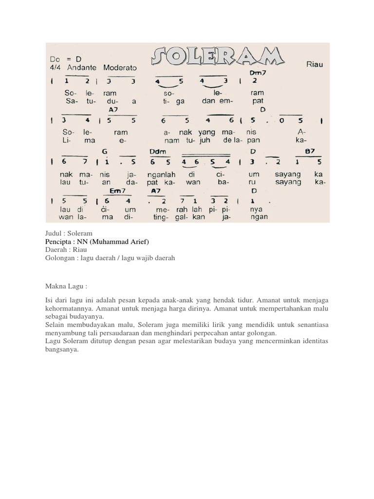 Daftar kunci ini bisa dijadikan contoh kunci gitar yang mudah dimainkan untuk kalian. Selain membudayakan malu Soleram juga memiliki lirik yang mendidik untuk senantiasa menyambung tali persaudaraan dan menghindari perpecahan antar golongan. Inti Arti Lagu Daerah Soleram Riau Indonesia dan makna pengertianya Inti Arti Lagu Daerah Soleram Riau Indonesia dan makna pengertianya Creasicomunity - Saya bersyukur telah mengajarkan Soleram pada anak-anak.